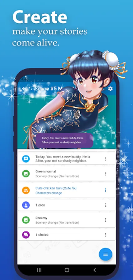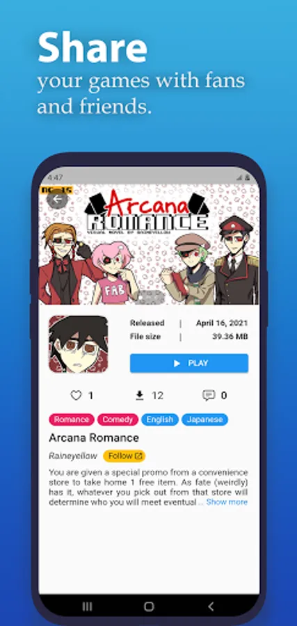 As a player you will have access to community developed stories made by visual novels and anime fans. As a creator, you have at your disposal a powerful and easy to use visual novel engine app.