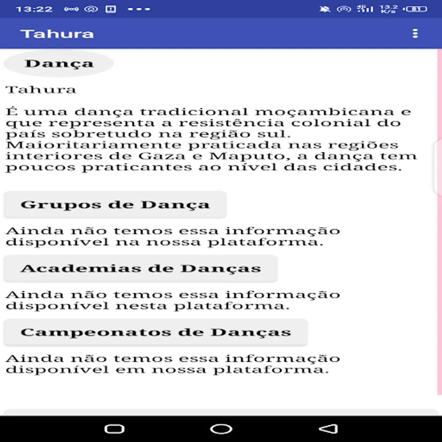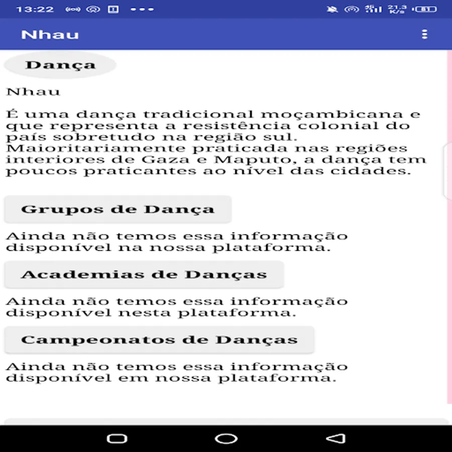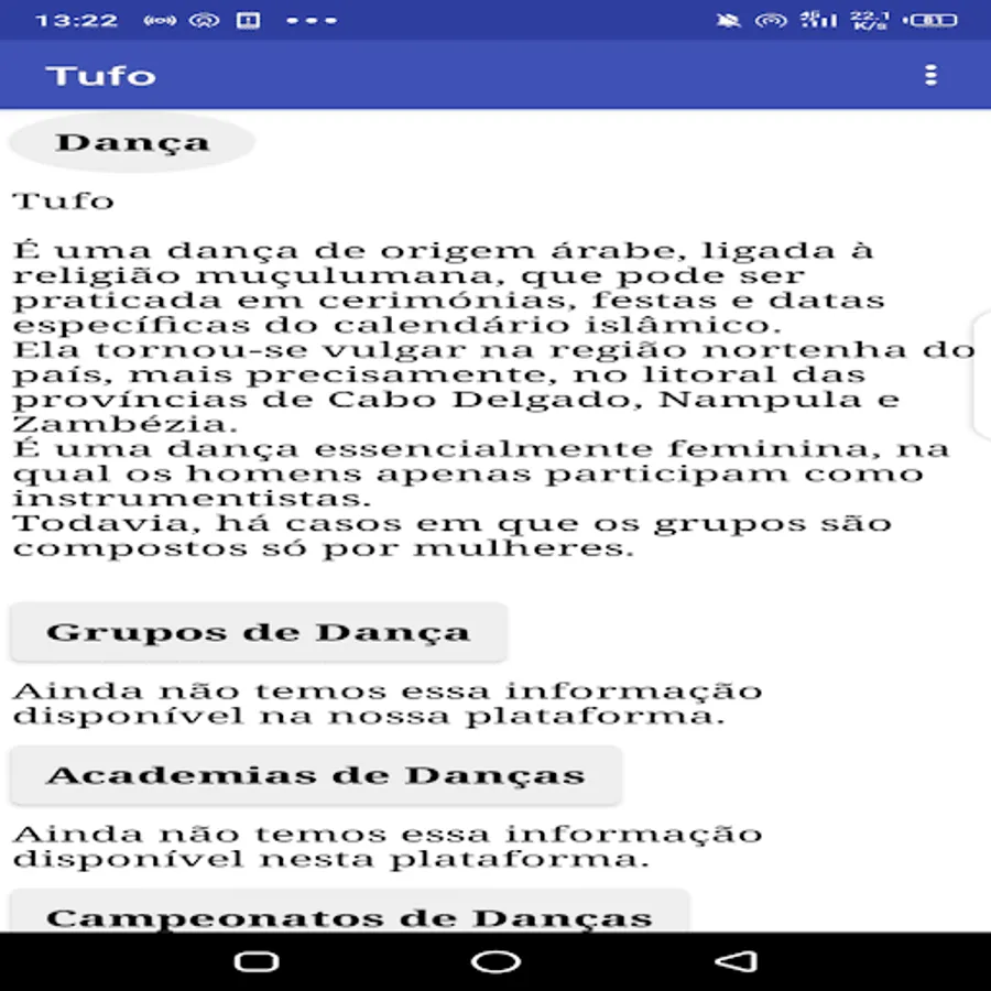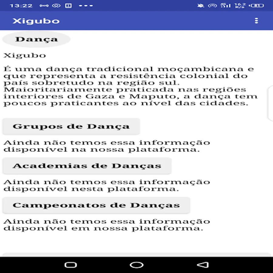 Application about traditional dances present in the territories of the South, Center and North of Mozambique, it is also a means of preservation and conservation of our roots and origins concerning dance.