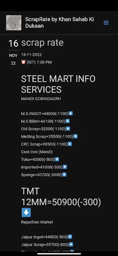 A app that can help you in knowing the latest Steel, Scrap, Ingot, etc. rates in one click. just open the app and refresh and boom! You will get all the details of market rates. The market rates are of all states and you will get the latest rates updated.