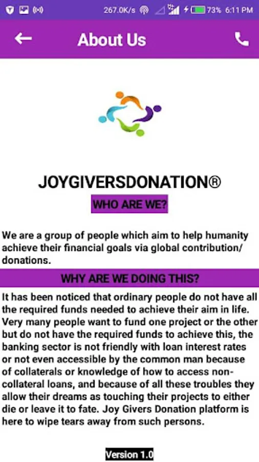 It has been noticed that ordinary people do not have all the required funds needed to achieve their aim in life. Very many people want to fund one project or the other but do not have the required funds to achieve this, the banking sector is not friendly with loan interest rates or not even accessible by the common man because of collaterals or knowledge of how to access non-collateral loans, and because of all these troubles they allow their dreams as touching their projects to either die or leave it to fate. Joy Givers Donation platform is here to wipe tears away from such persons.