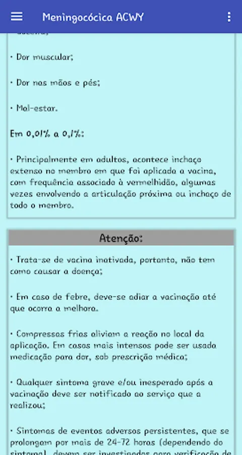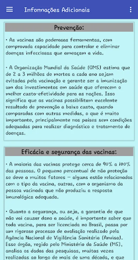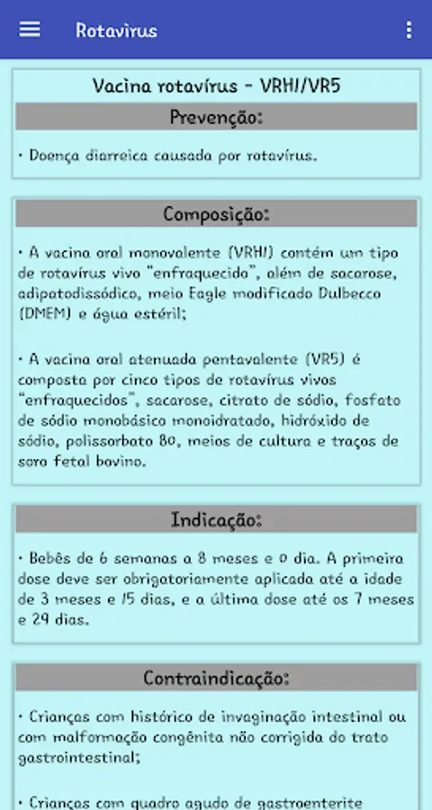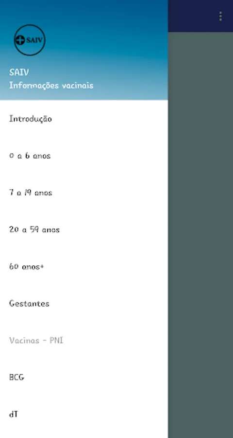 The SAIV application was developed in order to condense the main information about existing vaccines and made available both in the public and private networks. Such data are for health professionals, as well as for anyone who has an interest in the area; whether to study, apply, understand or simply follow up on the vaccination schedule in Brazil.
