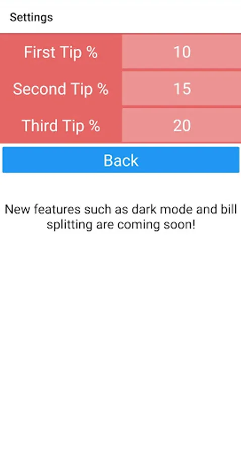- Quickly determine tip percentages with adjustable tip amounts
