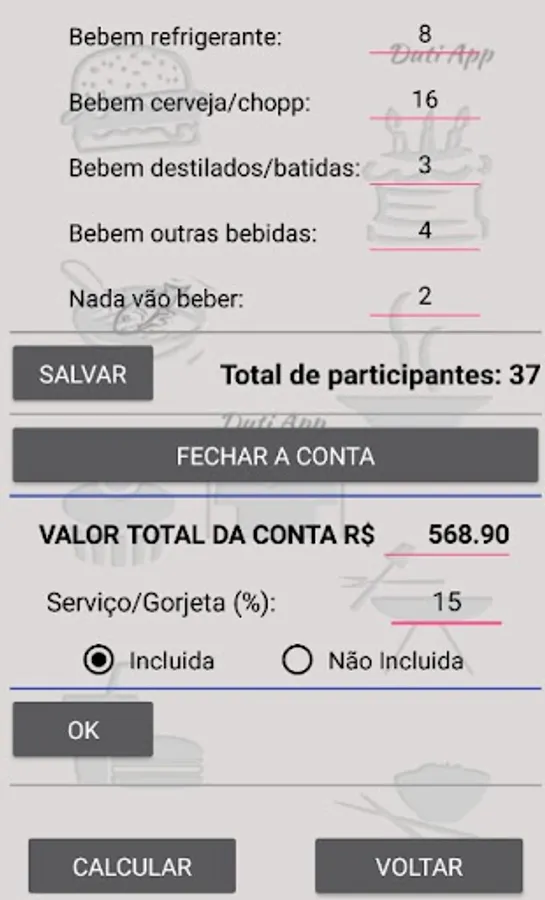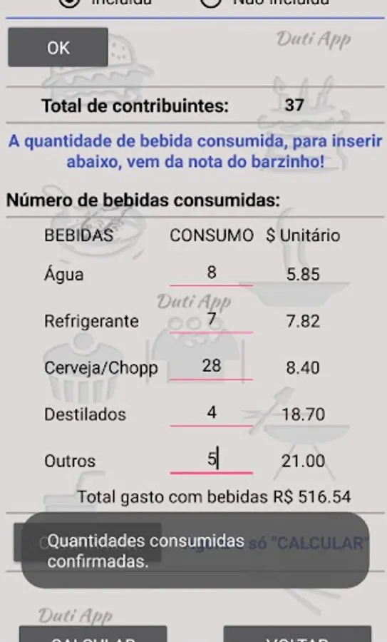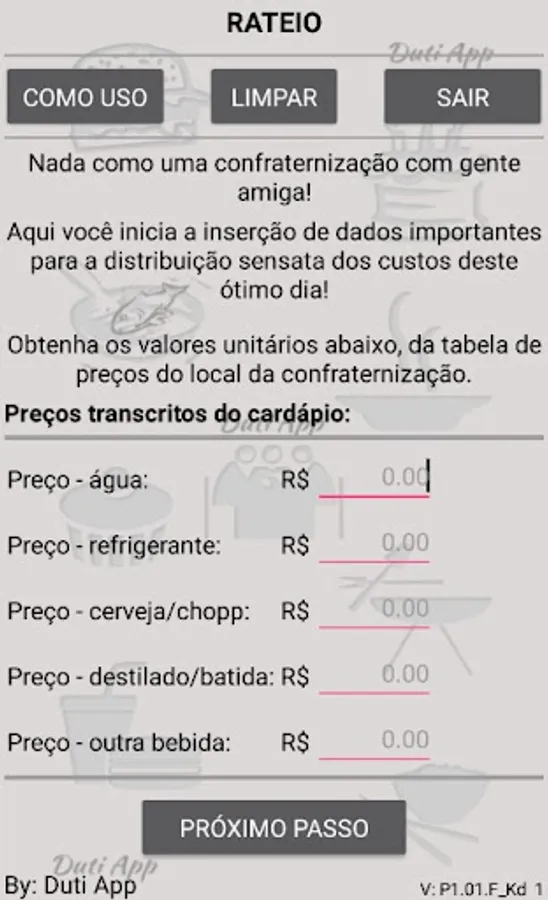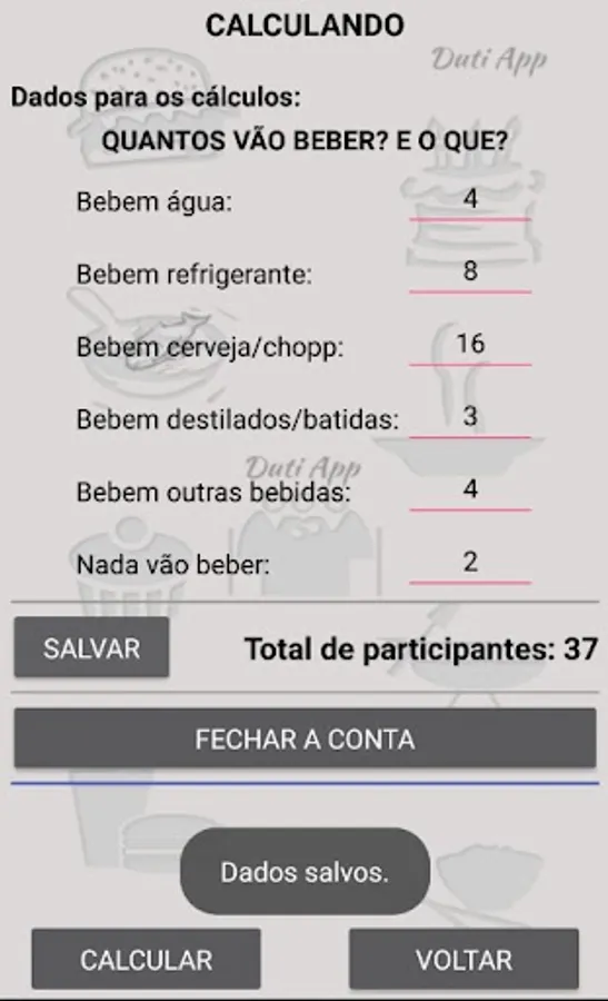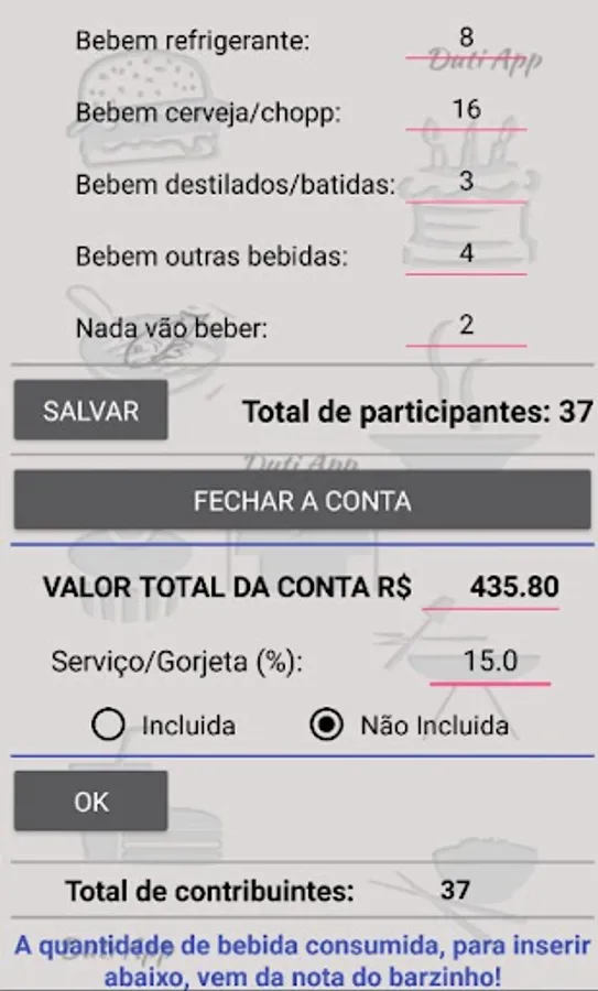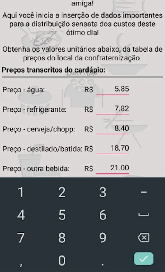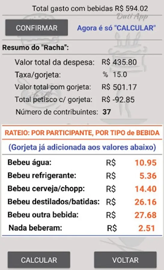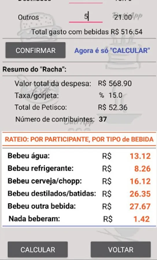 This problem will be less complicated with the "RACHA" app, because in it you will put the price of the drinks they intend to drink, with snacks being shared globally, thus planning your fun, your consumption and the contribution of each one of the group.