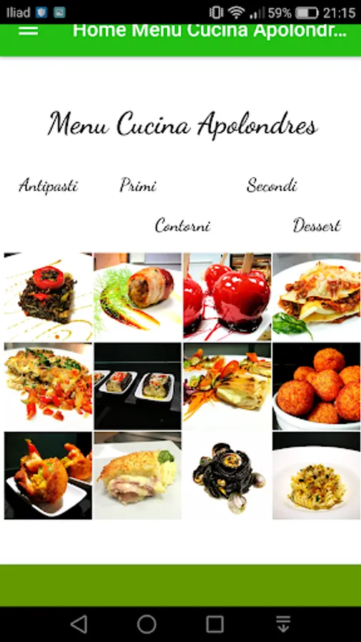 "Menu Cucina Apolondres" welcomes not only Italian but also multiethnic and vegetarian recipes: appetizers, first courses, main courses, side dishes, and desserts.