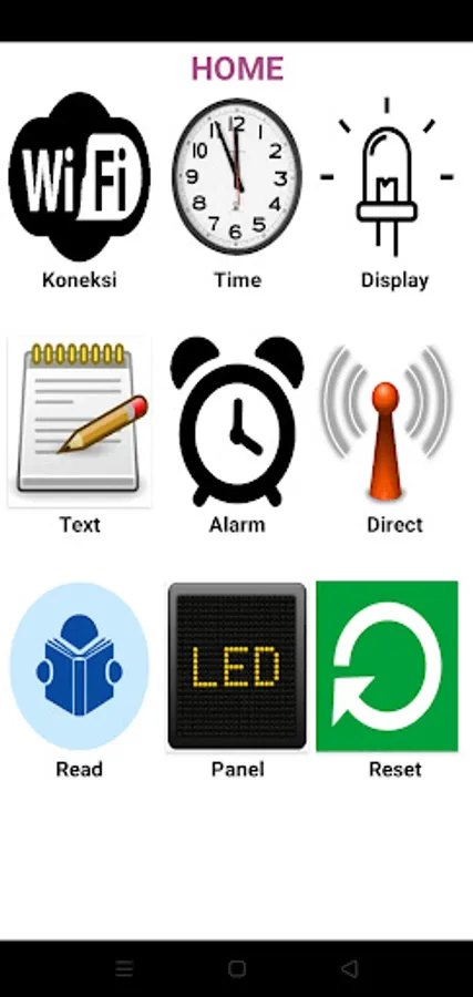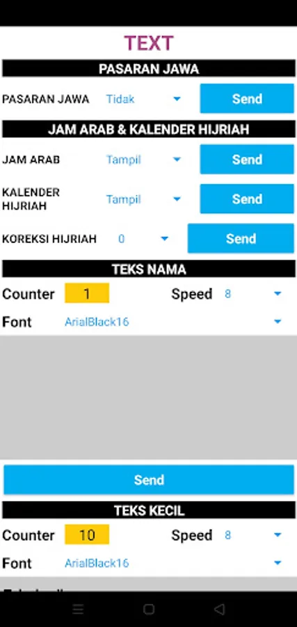 6. Display alternately: initial text info, small clock (hours, minutes), Gregorian calendar and Javanese market (can be turned on/off), hijri calendar (can be turned on/off), small text info, big minute hours, big Arabic clock (can be on/off). Info text 1 to info 9.