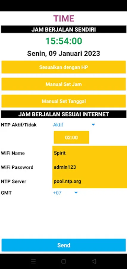 2. Certain hours to synchronize with the NTP internet clock so that the time is always realtime (must have wifi connected to the internet and can be turned on/off).