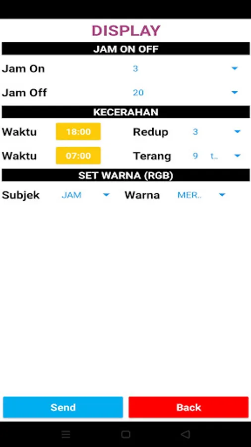 17. Set the iqomah countdown timer, set the minutes to display blank after iqomah, the start time of the iqomah timer can be automatic/manual using an external button