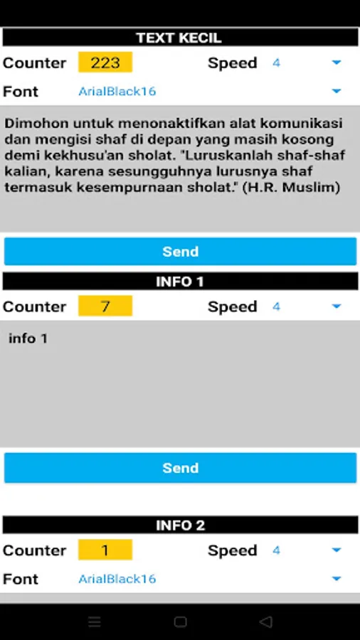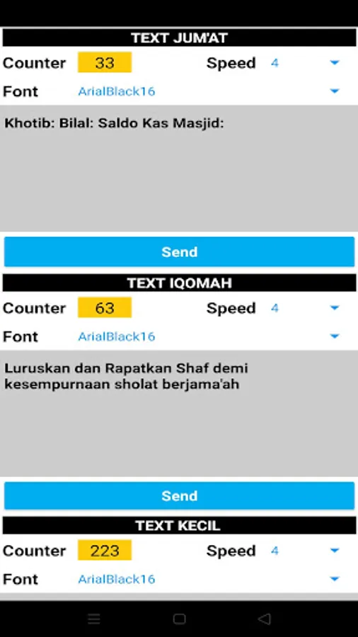 8. added running text as additional information. info on the name of the mosque, info on Friday, info on small text, text at iqomah, info on 9 texts (maximum 500 letters each)