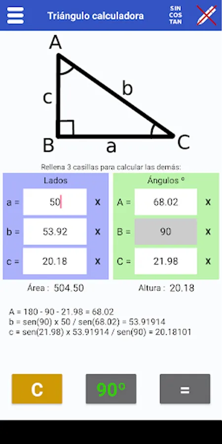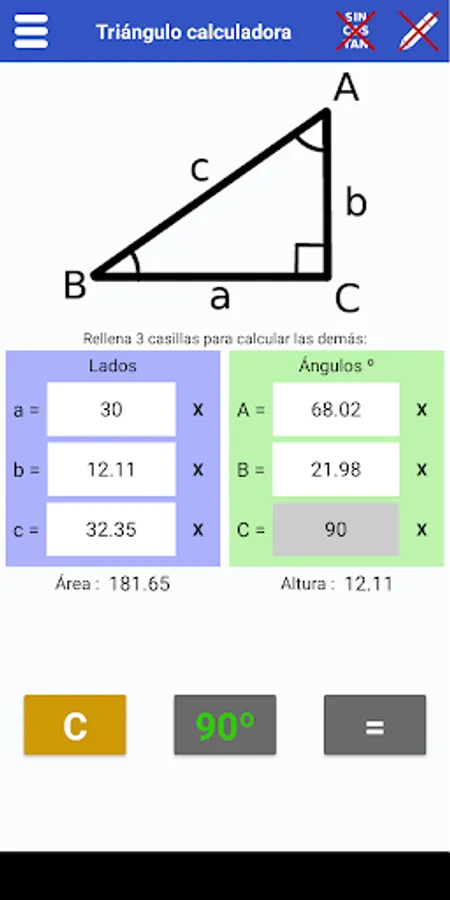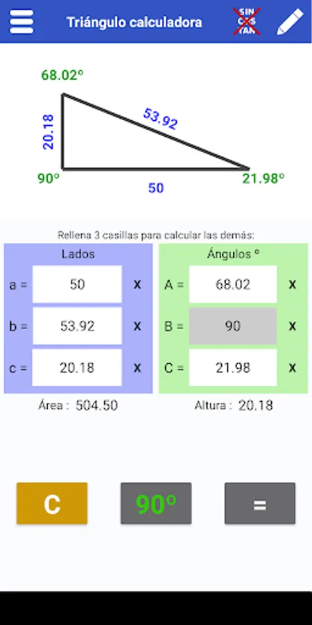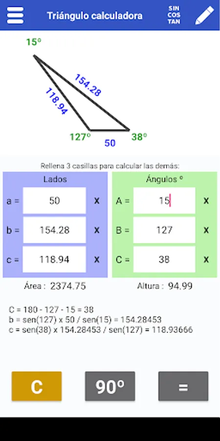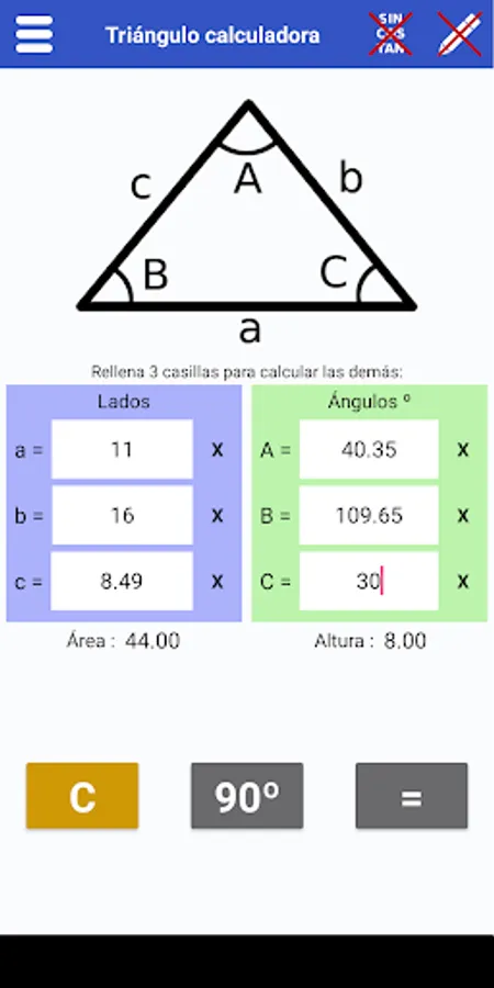 You can solve triangles by entering 2 sides and 1 angle or 2 angles and 1 side or 3 sides.