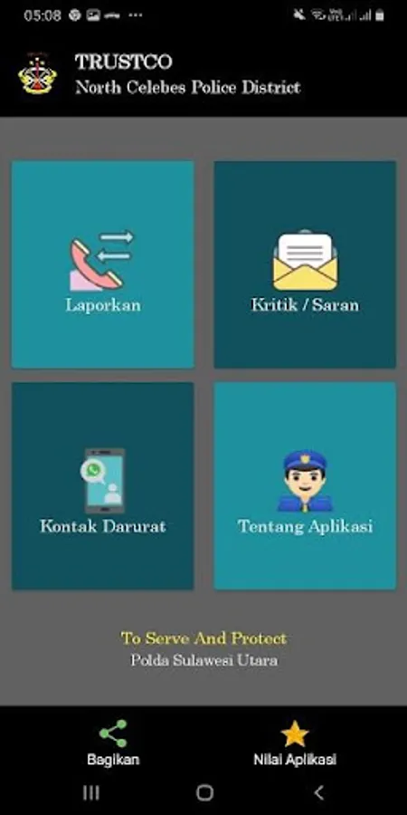 TRUSTCO - North Celebes Police District adalah aplikasi layanan masyarakat yang di kembangkan oleh POLDA Sulawesi Utara.Aplikasi ini sebagai salah satu inovasi untuk memantapkan Harkamtibmas di wilayah hukum POLDA Sulawesi Utara,sehingga terwujud rasa aman dan nyaman bagi masyarakat.