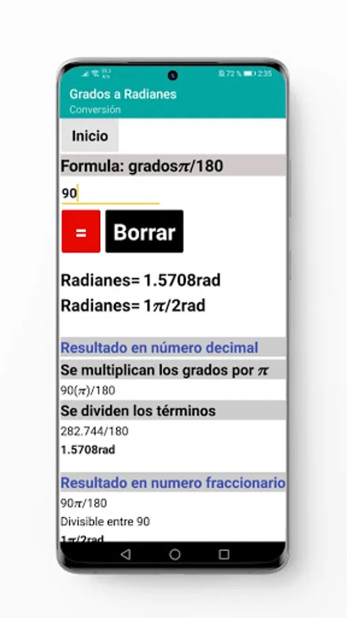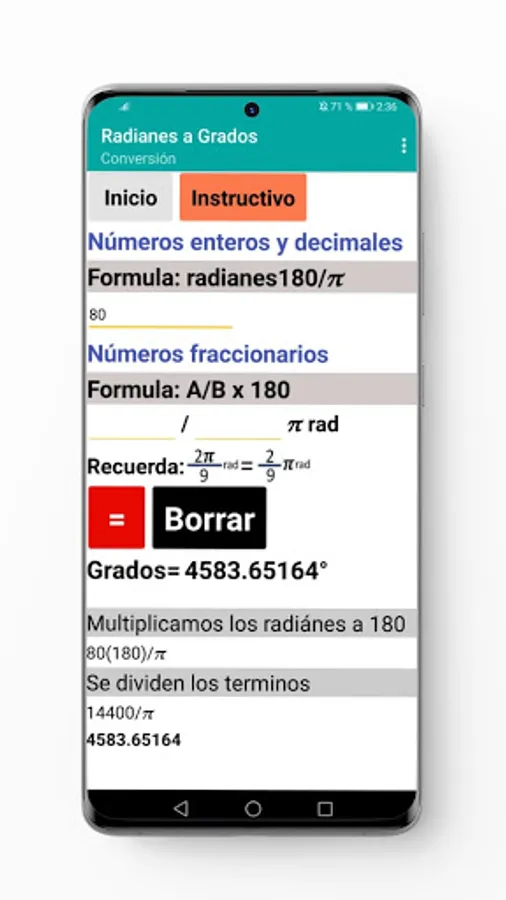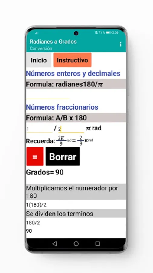Converts degrees to radians and from radians to degrees with procedure gives both its result in decimals and in fraction