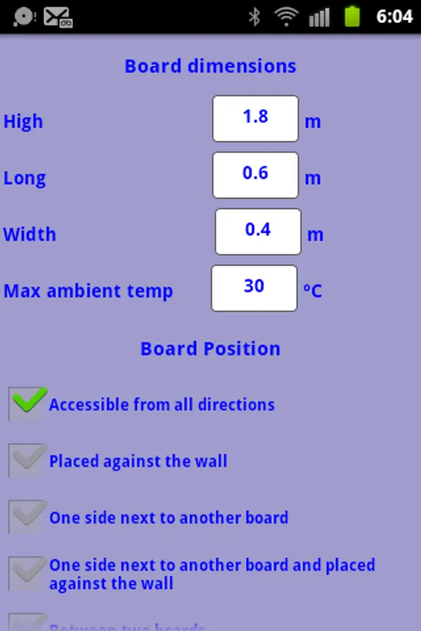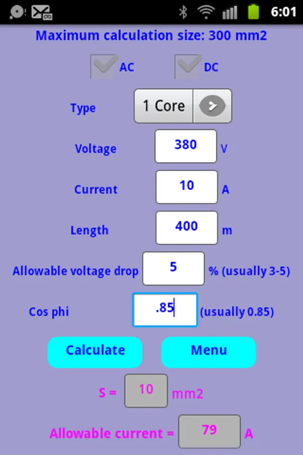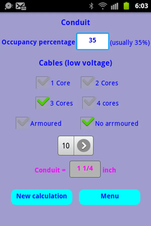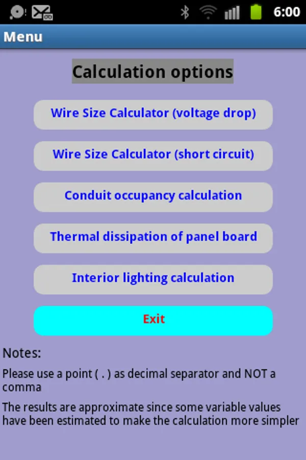 With this app you will be able to select the correct cable, calculated for voltage drop and short circuit. You can also select the correct conduit based on the cables you need within it. You can calculate the interior lighting in a room and the maximum temperature of a panel board based on dissipated power of its internal components