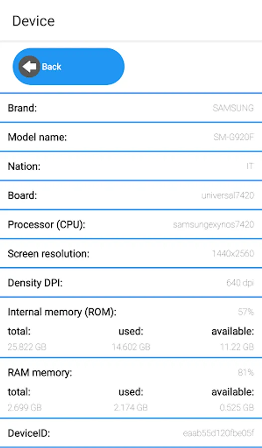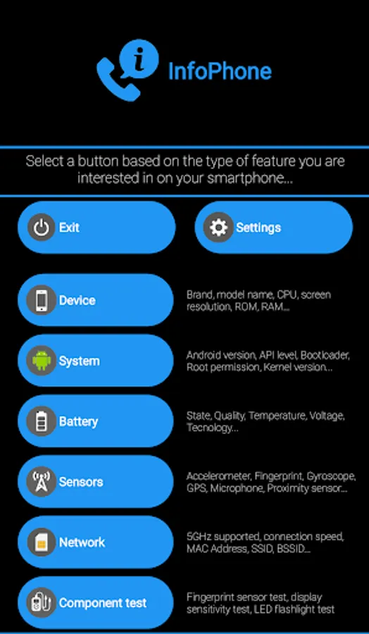 InfoPhone allows you to know the features of your smartphone in real time! InfoPhone shows the features regarding the device (brand, model name, nation, CPU, RAM, internal memory and more ...), the system (android version, API level, bootloader, root permission, Kernel version and more ...), the battery ( state, quality, temperature, voltage, current and more ...), sensors (accelerometer, fingerprint sensor, gravity sensor, gyroscope, position, microphone and more ...), SIM Info (network operator, phone number, SIM serial number, cell ID , signal strength dBm and more ...) and finally you can test the hardware components of your device (fingerprint sensor, display sensivity, LED flashlight and more ...)