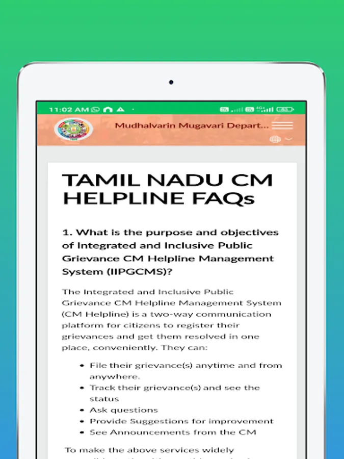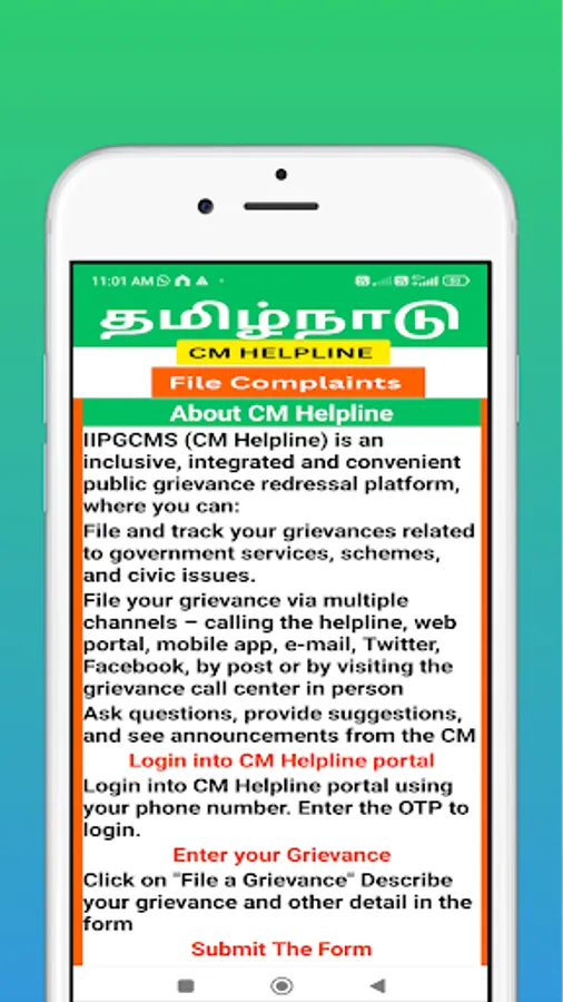 ✔ (CM Helpline) - இது உள்ளடக்கிய, ஒருங்கிணைந்த,மற்றும் எளிமையான பொது மக்கள் குறை தீர்க்கும் உதவி மையம். இதில் நீங்கள்: