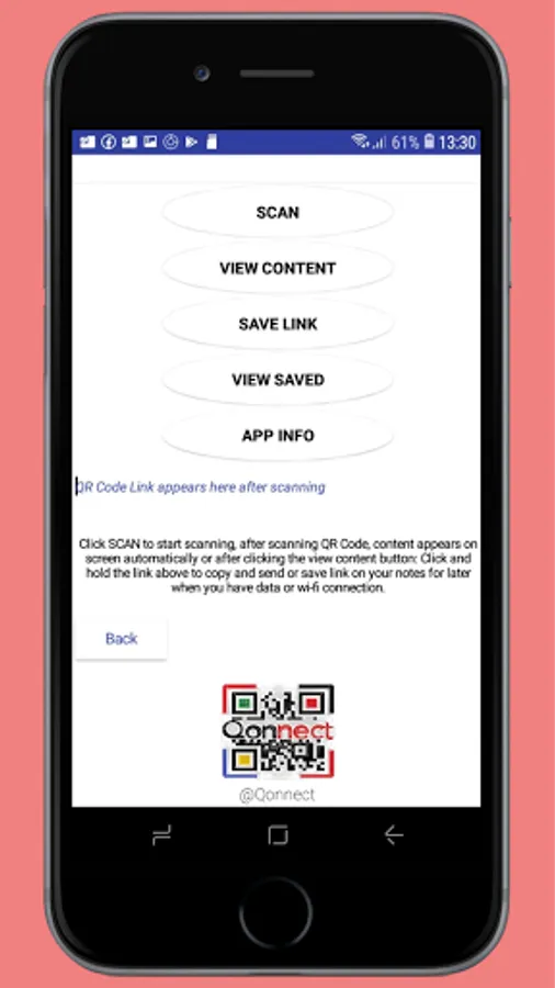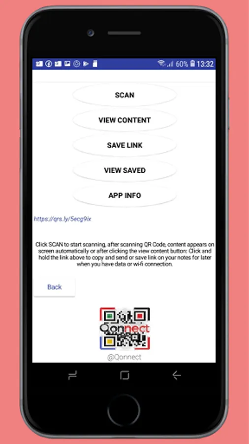 Qonnect QR code scanner is an extremely easy to use QR Code scanner app and yes it's FREE; You simply click the scan-button and point QR code scanner to QR code you want to scan and Qonnect QR Code scanner will automatically start scanning and then QR scan it. No need to press any more buttons, the content contained on qr code automatically appears on screen or after clicking the view content-button to activate and view content. When off-line/without data or wi-fi connection you then just have to click and hold the link/text/url that appears on the black text-box to copy and send/save/paste it on web browser to access content imbedded in the QR Code.