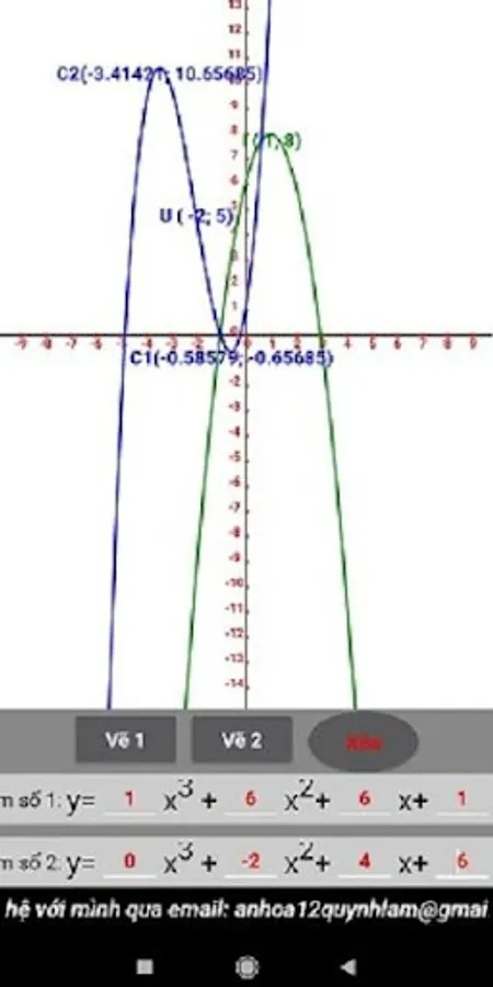 Enter the coefficients a, b, c, d of the function so that the calculation program gives the shape of the graph and the coordinates of points on the graph. For example, the order 3 function will have inflection point (U), extreme points C1 2 - maximum and minimum; quadratic function will have vertex (I)