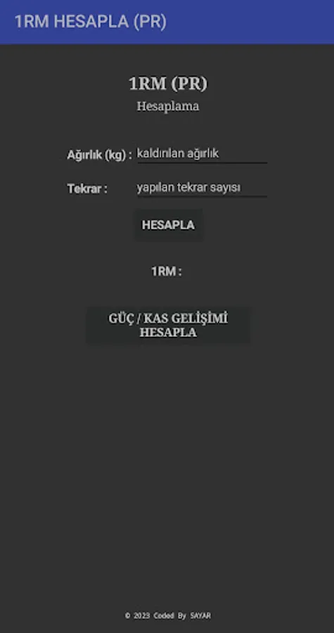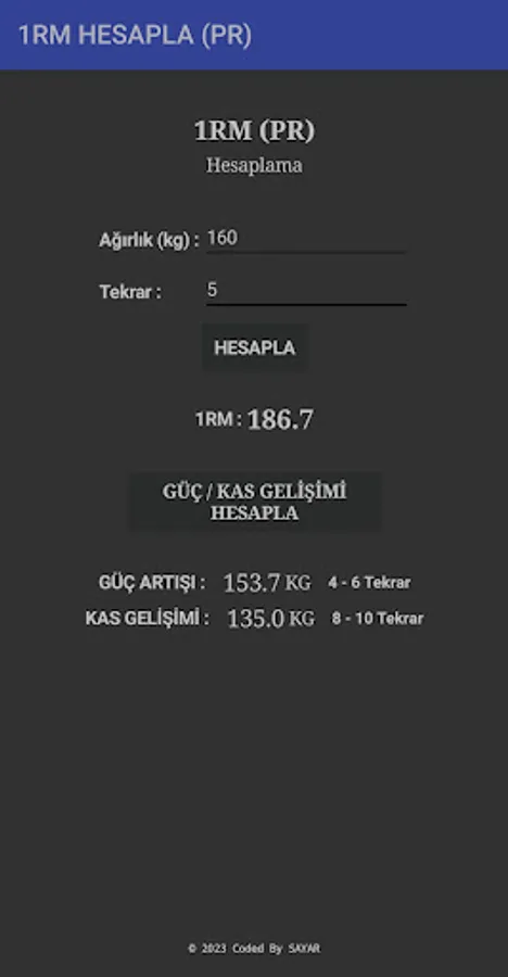 4- By pressing the "Strength / Muscle Development" button, the number of repetitions you need to do for muscle mass gain and strength increase and the amount of weight to be used will be calculated over our 1RM weight calculated.