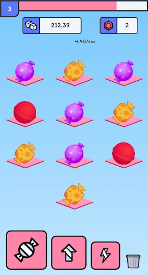 Become a candy gazzilionaire by strategically merging candies and buying useful upgrades in this fun and relaxing idle game. Collect gems to spend on even more boosts for your candy collection to truly have a booming candy factory.