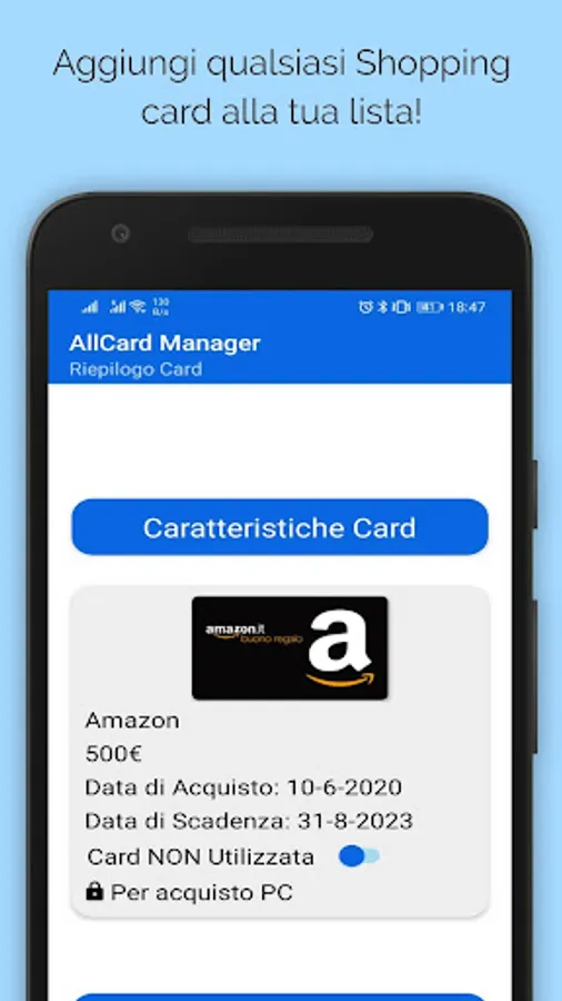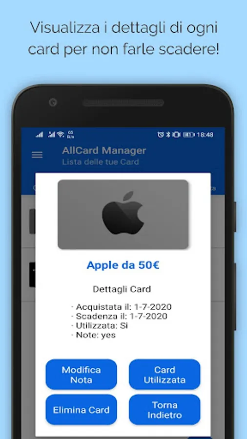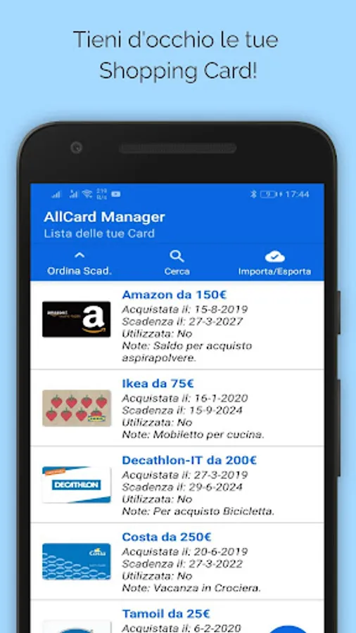 AllCard Manager is a Shopping Card manager. You can add more than 300 Cards to your list of Cards, as well as its value in €, the date of purchase, the expiry date and a comment.
