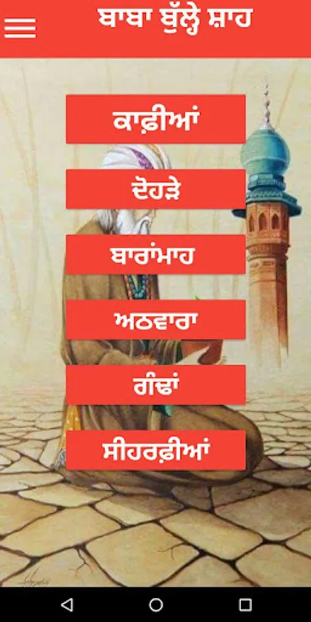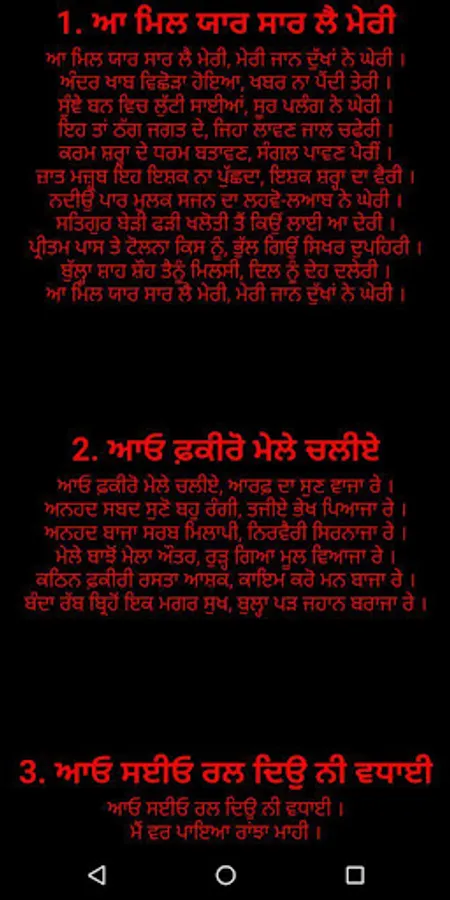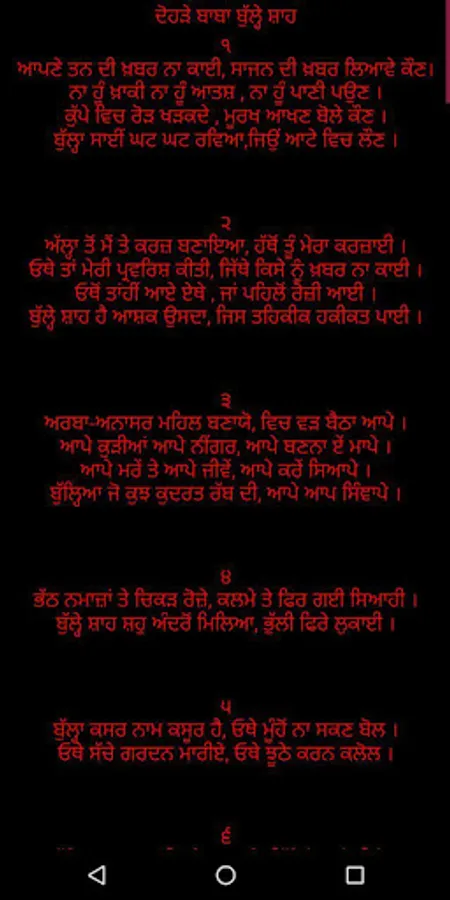 This app contains poetry of Baba Bulleh Shah . Bulleh Shah has written famous compositions like Kafian, Dohre , Barahmah, Athwara, Gandan and Sehrifian. Baba Bullah Shah has shown extreme bravery and secularism while writing against the religious bigotry and tyranny of the rulers of his times.