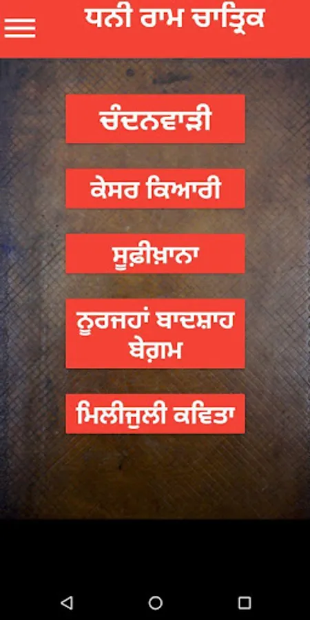 This app contains poetry of great punjabi poet Dhani Ram Chatrik. Dhani Ram Chatrik is counted among the legendry poets of Punjab along with Bulleh Shah, Waris Shah, Shiv kumar Batalvi, Pash, Surjit Patar etc .He wrote many books like Chandanwadi, Kesar Kiari, Sufikhana, Noorjahan Badshah Begum, Milijuli Kavita etc .