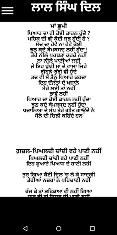 This app contains poetry of Lal Singh Dil. Lal Singh Dil was famous poet of Punjabi who wrote dalit poetry ie poetry of the downtrodden . He is counted among the greatest poets of punjab like Pash, Sant Ram Udasi, Shiv Kumar Batalvi, Waris Shah, Bulleh Shah, Hashim Shah, Shah Hussain , Surjit Patar etc .
