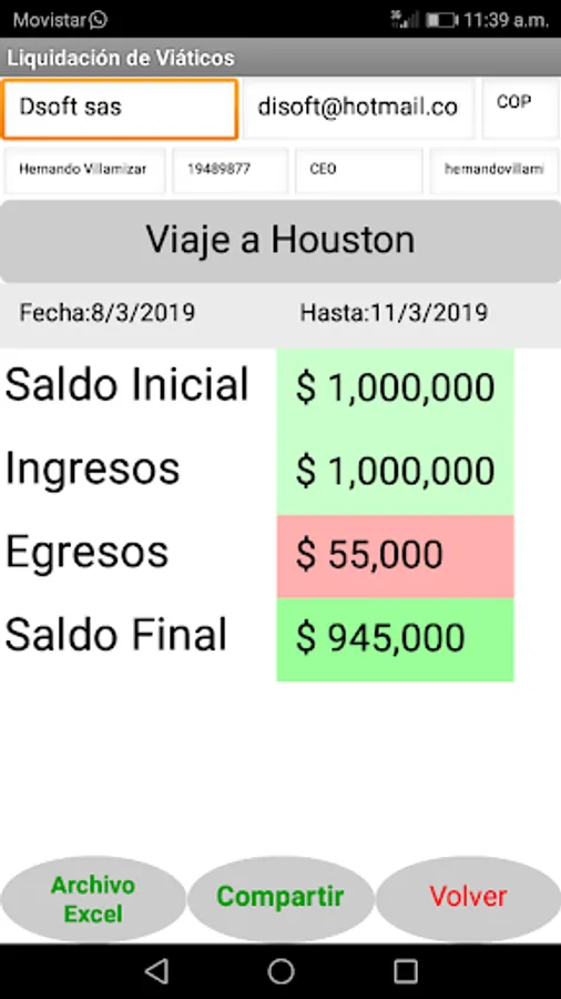 2.7.Every time you want, to know the balance of the trip, or at the end of the trip, you can press the Travel Allowance button (Movement screen, bottom left) to summarize all the movements and tell you if you owe or owe balance.