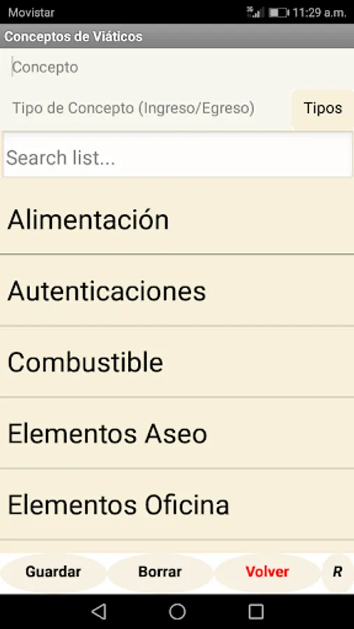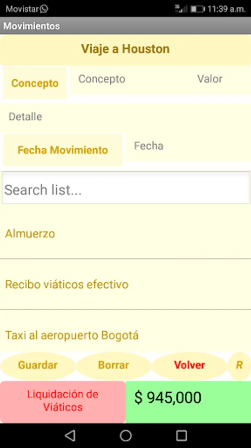 2.5.Movements: in this screen you can create each of the expenses or income of the trip in question, the name of the trip will appear above.