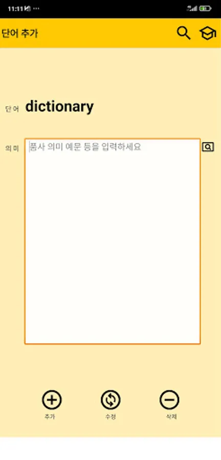 단어 검색후 암기 필요한 경우 단어장에 추가할 수 있고 수정하거나 삭제할 수 있습니다.