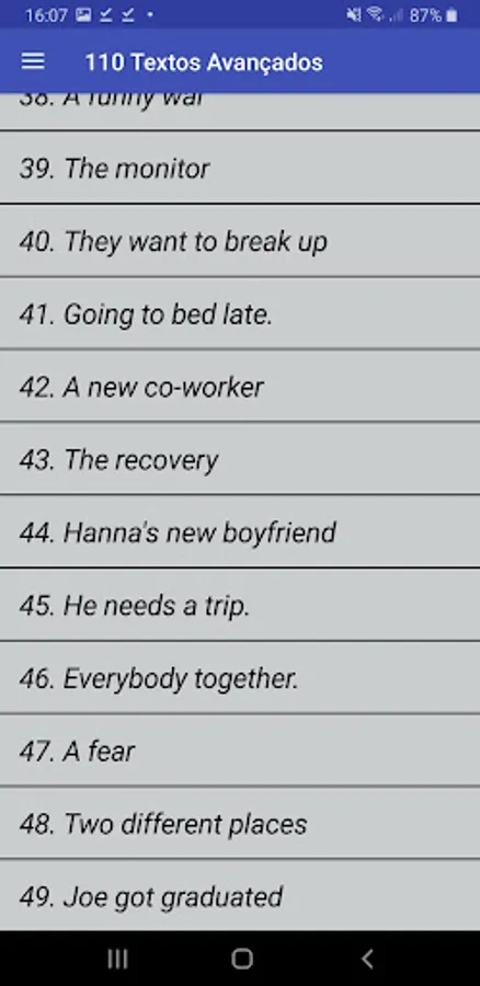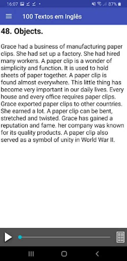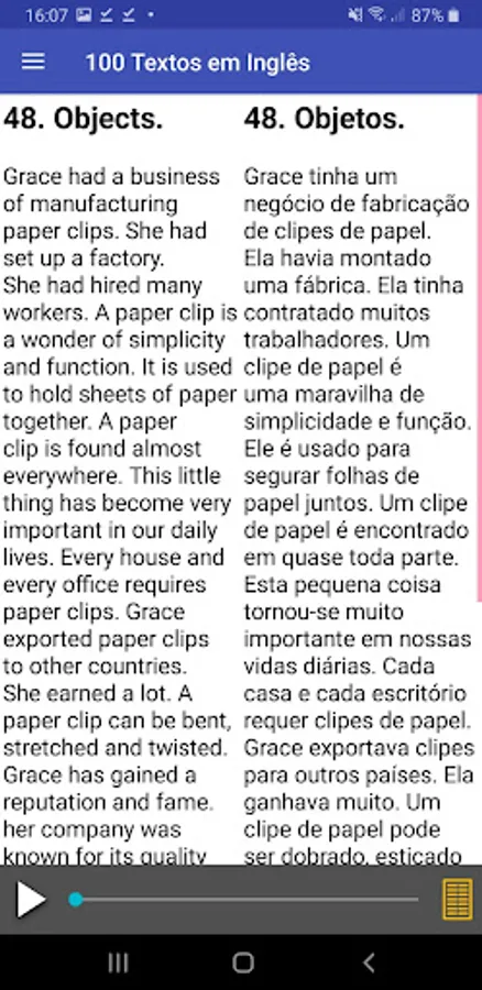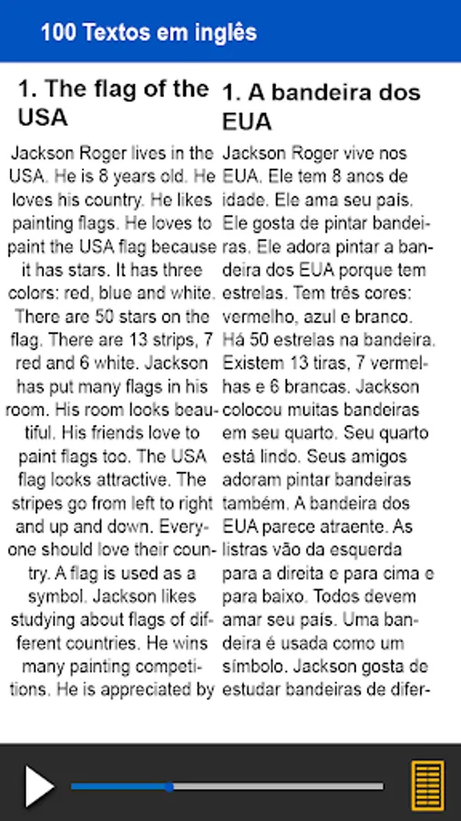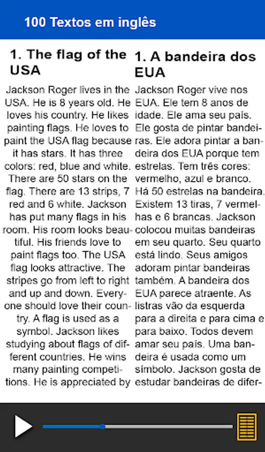 This application came to facilitate the study of those who learn English through texts. Without a doubt, learning English through texts is the best way to learn a language. Therefore, this application brings several texts in English with audio and translation, covering unusual stories that will increase your English vocabulary considerably.