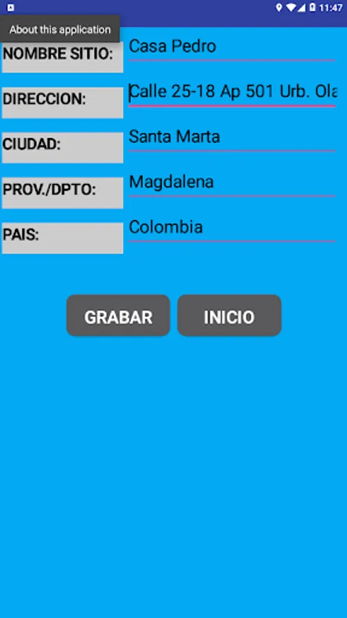 Users can register up to 2 addresses, calls Site A and Site B, they can also have personalized an emergency message previously and when the case is presented, by pressing the emergency button, then choose between the buttons of Site A, Site B o My location, they will immediately enter the whatsapp application with a message ready to be sent to the receiver they choose. If the button of Site A or Site B is chosen, the message will include a specific address of the place where the help is needed, if the button of My location is chosen, the message will include an approximate geographical location, plus the location in google maps with the level of accuracy expressed in meters (whole number plus 3 decimals) of the place of emergency.
