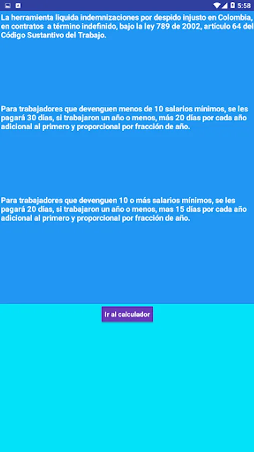 The tool calculates the days and the value of compensation for dismissal without just cause in an indefinite term contract in Colombia under law 789 of 2002 and article 64 of the substantive work code. Simply choose the final date or date of withdrawal, the initial date, automatically calculate the days worked, indicate the monthly salary without transport aid and automatically calculate the value of your compensation. The tool will ask if your salary is less than 10 minimum wages from the withdrawal date and according to your answer will make the respective calculations. The only thing you will have to type is your base salary.