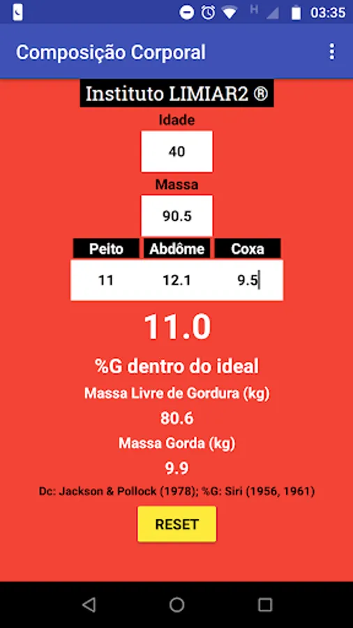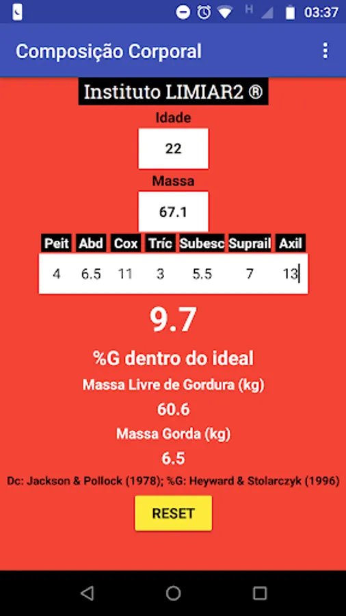 The main objective of evaluating body composition is to determine the percentage of fat. Among the various possible methods, the one involving the measurement of skinfolds can be quite accurate - if the equations to be used are well chosen. In this application the following equations were inserted:
