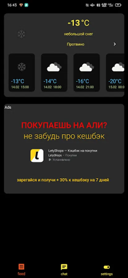 In this application, you can also see the weather forecast for 3 days by choosing city in Russia from a huge list or find out the weather for any place on Earth by sending your location by clicking on the picture in the card. You can also save the location for quick retrieval of weather information in the future right in this app!