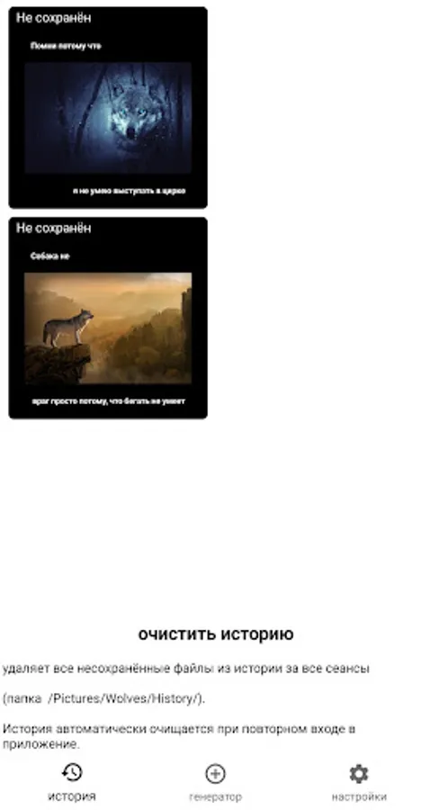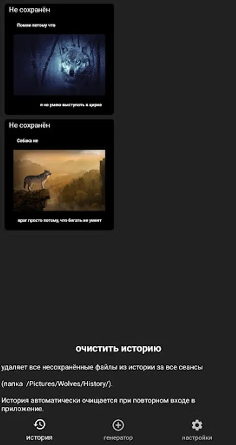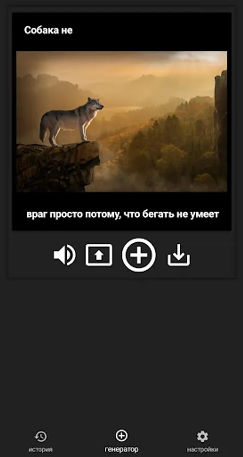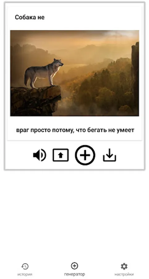 The wolf is weaker than the lion and tiger, but the wolf does not protrude in the circus. And yes, here the wolves do not act, but generate quotes to themselves randomly - everything is done based on memes with wolves: genius, it is everywhere. In this application, the very soul of the wolf lurks, which reveals itself from different sides and your consciousness just flies up, realizing the whole meaning of the existence of these lonely animals.