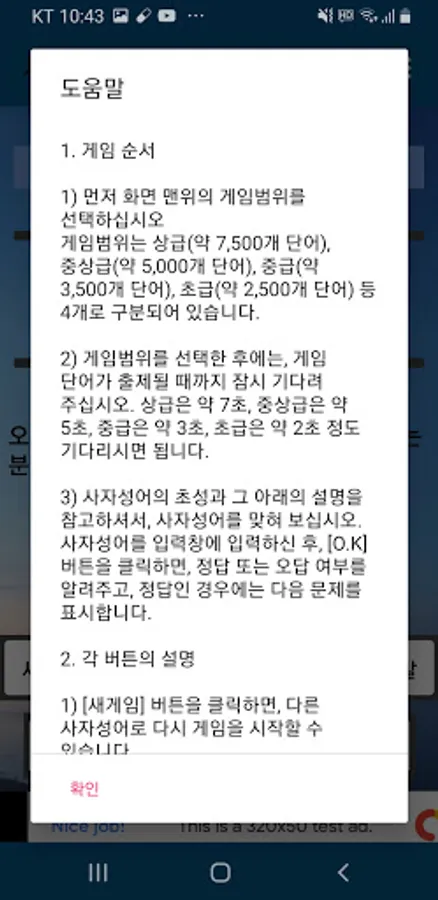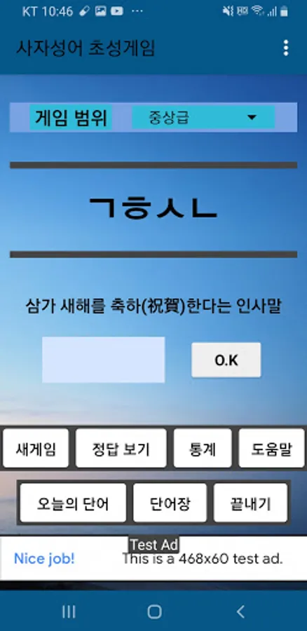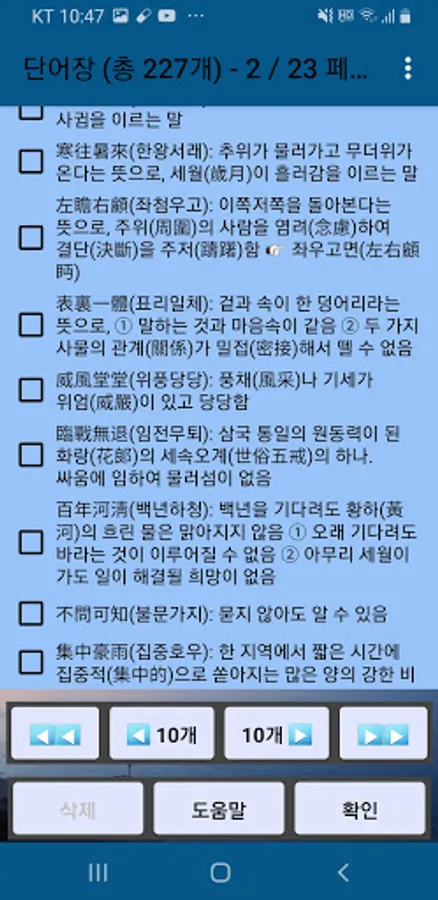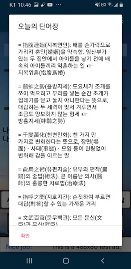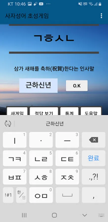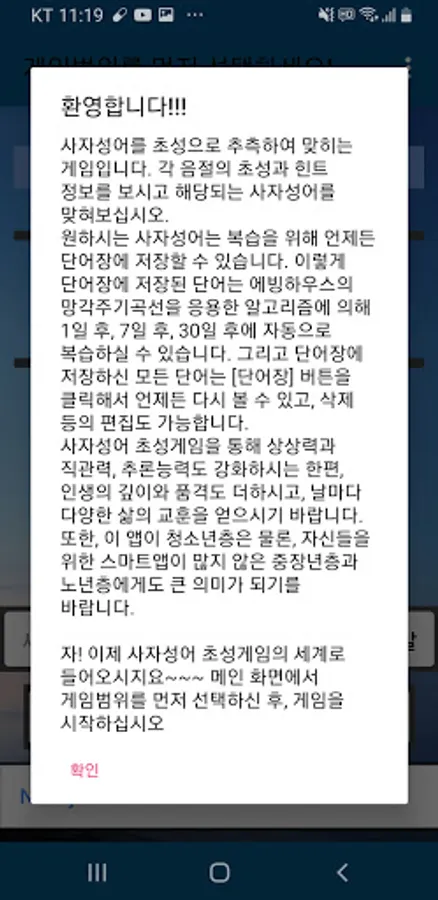 2) If you click the [View correct answer] button, you can see the Chinese character and Korean pronunciation of the proposed lion acronyms. However, clicking this button means to pass the current game word, and thus a new idiom is presented. It is recommended that you click this button only when the correct answer is no longer known. After viewing the correct answer through this button, you can save the corresponding dead word in the vocabulary book and review it later.