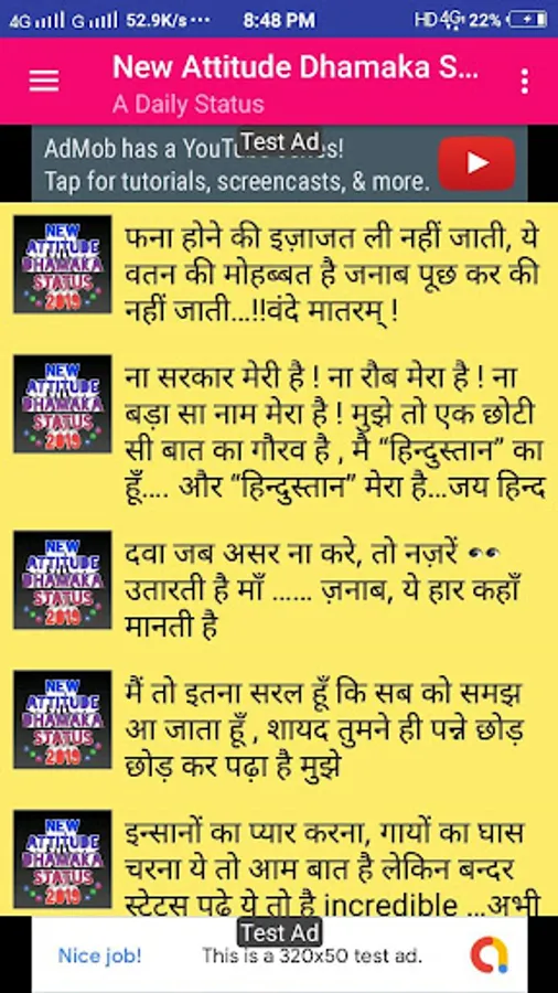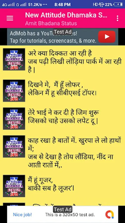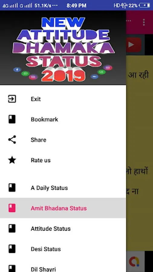 New Attitude Dhamaka Status is the most popular status application. New Attitude Dhamaka Status has all categories of status and all type of status. Status in this application is in Hindi language. Some categories of New Attitude Dhamaka Status application as follows :-