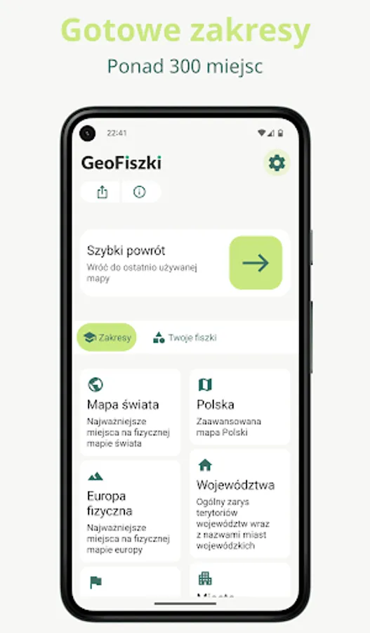 Geo Flashcards is an application for learning extended geography in high school. The application includes the scope of knowledge required in T15 in Wrocław, but can also be used in any other school.