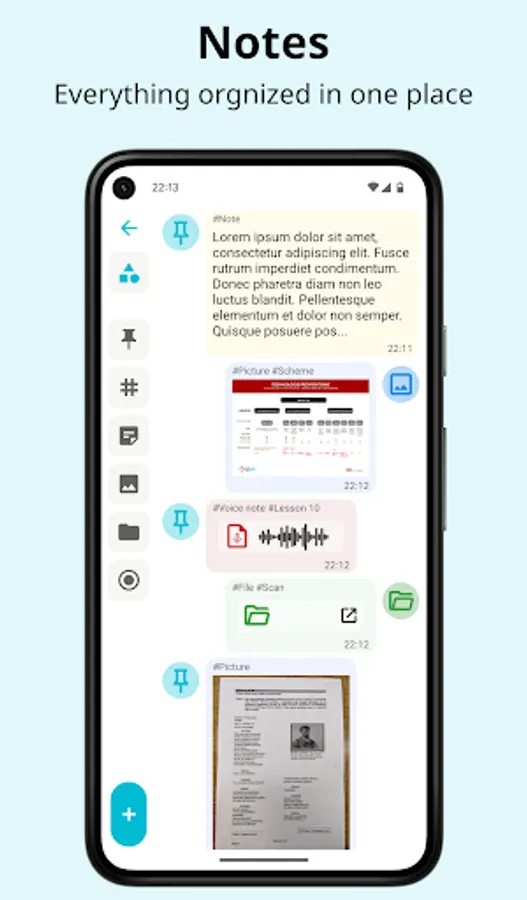 -There is a dedicated space for all your notes: text, images, scans, photos, videos and records. You can easily organize it thanks to tags.