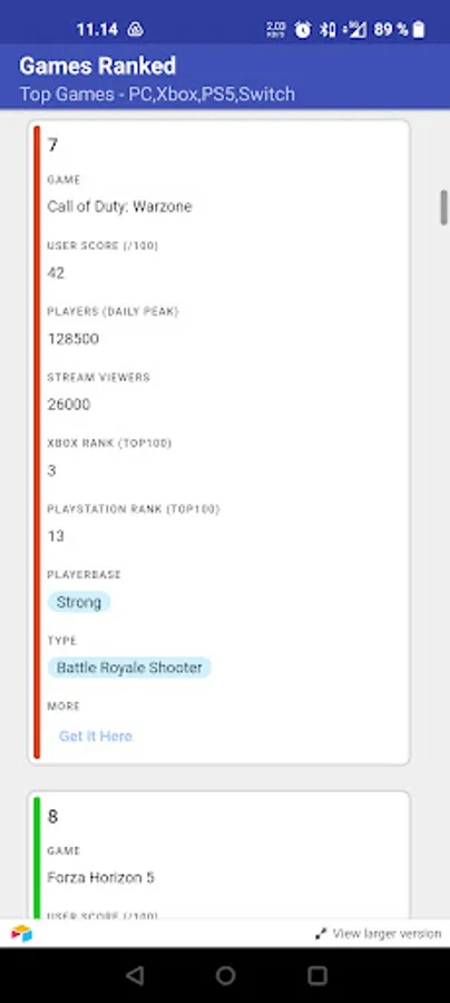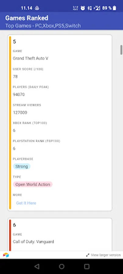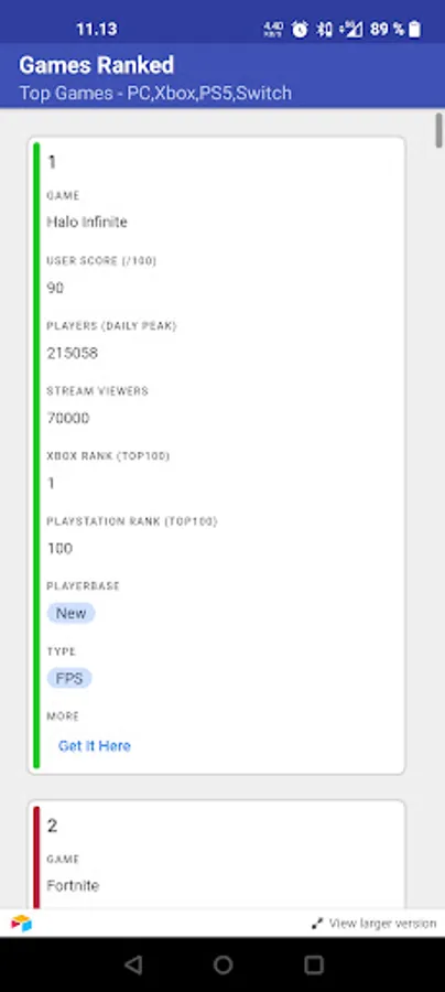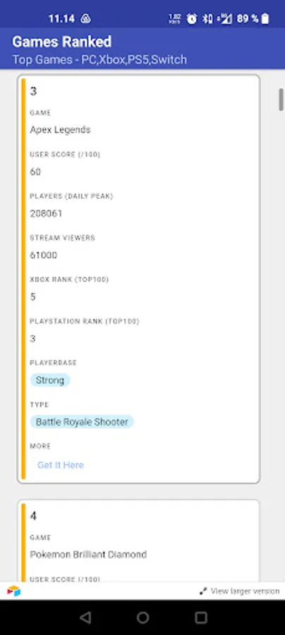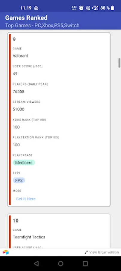 Games Ranked is a ranking list based on an algorithm that follows player counts, stream numbers and review scores by users and critics.