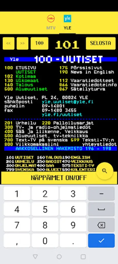 Text TV is now conveniently available as a mobile app that does not require registration or collect user information. Includes YLE's teletext and MTV's teletext services. Yle pages 100-899. MTV pages 100-700. A classic quality service for the news and sports hungry in a convenient easy application.