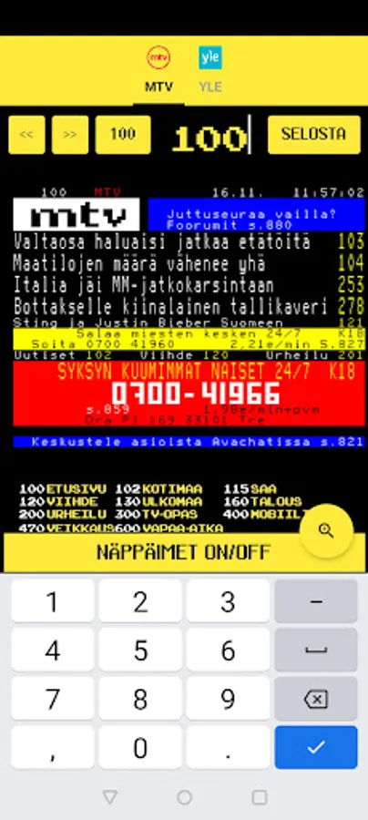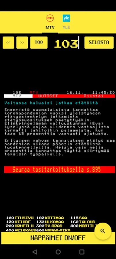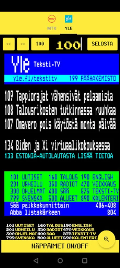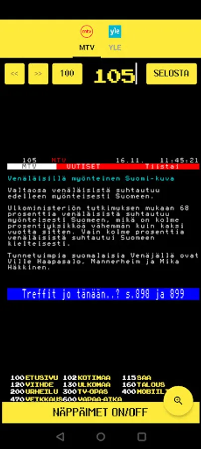 You can easily scroll through the pages with the keys and select the main page with the number keys. The application is fast and finds the page of your choice immediately. Many users have noticed the many benefits of this application and have switched to using only Teletext Finland as their teletext application. The app is really light on the battery.