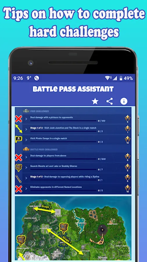 Battle Pass Assistant app is a challenges & missions guide that helps you to complete weekly challenges or event challenges and give you detailed tips on how to complete battle pass challenges by showing challenges locations on the map. This challenges helper app will make you tier up fast and level up to reach tier 100 in a short time in the new season of the popular game mode Battle Royale.