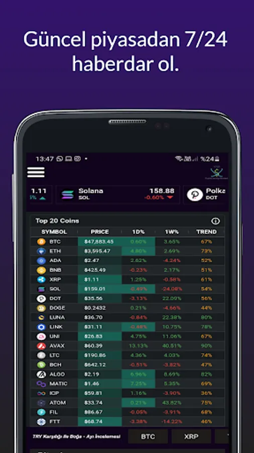 Yatırım Tavsiyesi Değildir (YTD) Kripto Para Asistanı ile majör 20 kripto paranın 7/24 durumunu inceleyebilir, günün en çok kazandıran ve kaybettiren altcoinlerini takip edebilirsiniz. Uygulamamız ile ayrıca belirli büyük şirketlerin hisse senedi fiyatlarını/grafiklerini analizleriniz için kullanabilirsiniz.