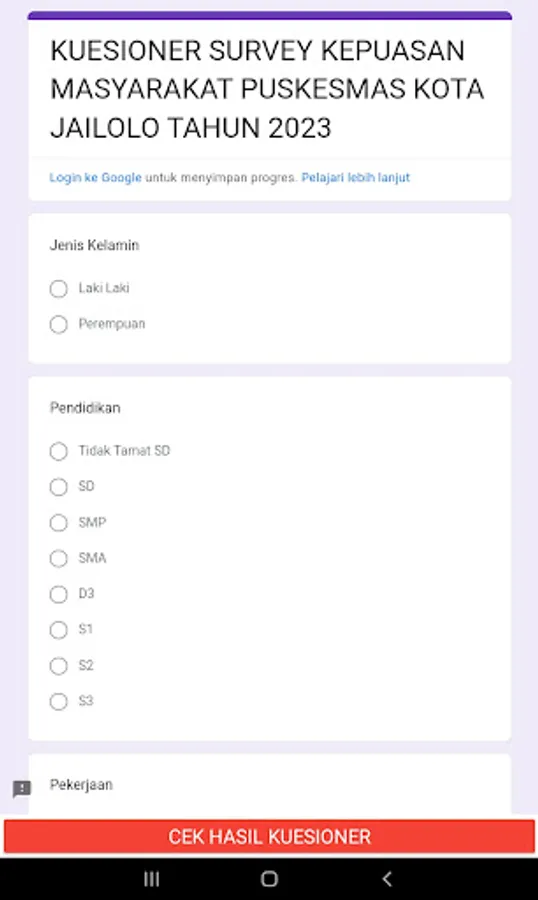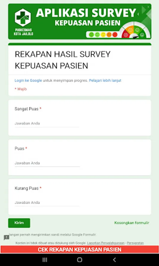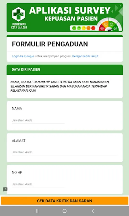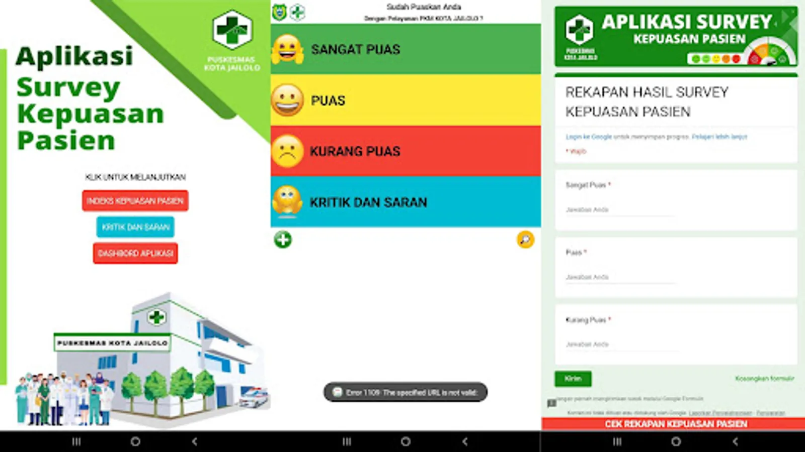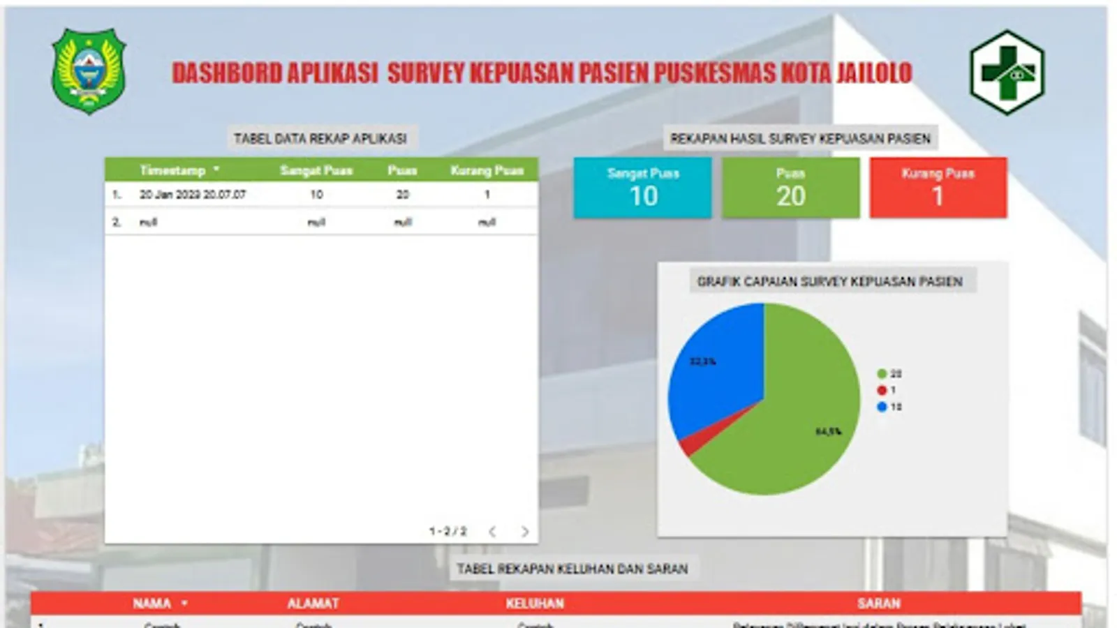 APPLICATION TO DESCRIPTION OF PATIENT SATISFACTION IN JAILOLO CITY HEALTH CENTER SERVICES, THIS APPLICATION IS COMPLETED WITH PASEIN SATISFACTION INDEX, RECOMMENDATION OF PATIENT SATISFACTION INPUT RESULTS, SUGGESTIONS AND PATIENT CRITICISM ON JAILOLO CITY HEALTH CENTER SERVICES AND PATIENT SATISFACTION RESULTS DASHBOARD. THIS APPLICATION IS USED TO SEE HOW THE SERVICES AT THE JAILOLO CITY PUSKESMAS ARE REVIEWED AND WHAT IMPROVEMENTS SHOULD BE DONE TO IMPROVE HEALTH SERVICES AT THE JAILOLO CITY HEALTH CENTER BETTER IN THE FUTURE