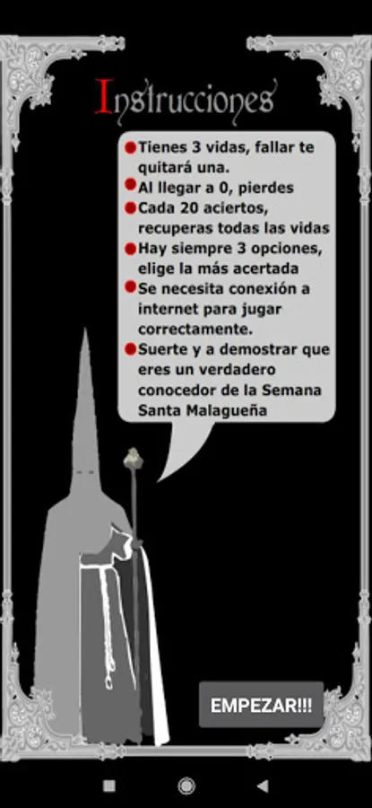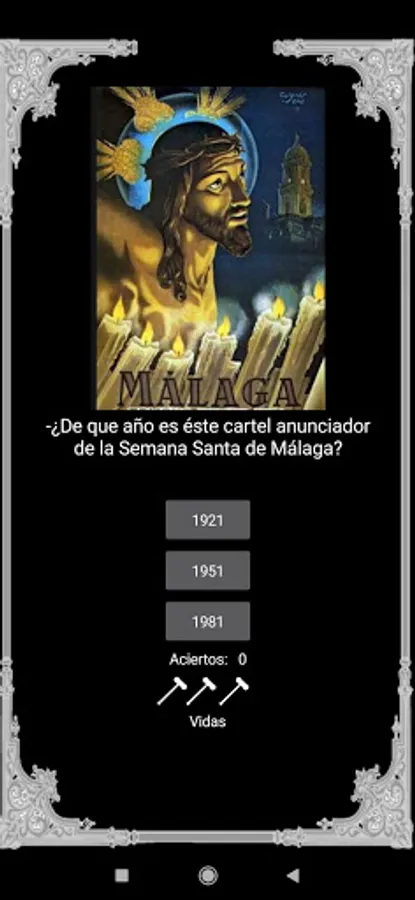 In this question game about Holy Week in Malagueña, you will have to answer the questions they ask, choosing between the three available options. Some will be text, others with images and others with musical fragments. You have three lives and will lose each time you fail, but you will recover all three for every twenty correct answers. Show what you know and share your score with others.