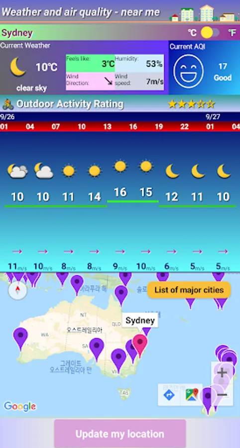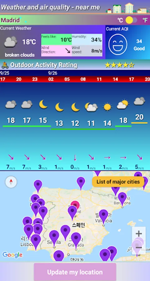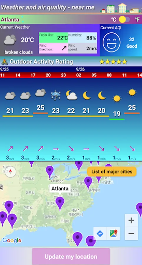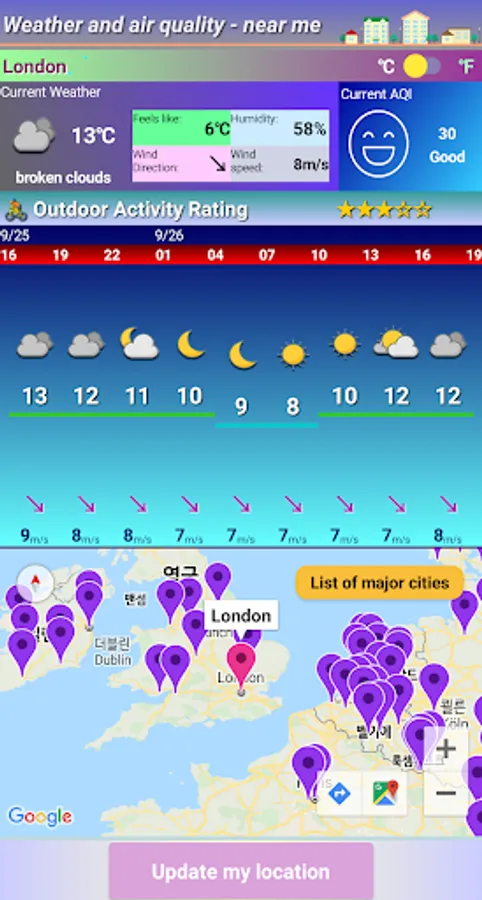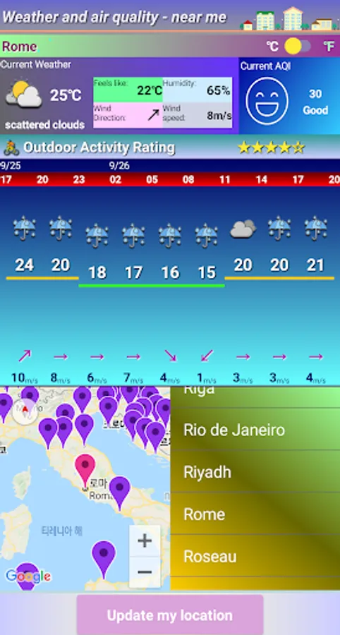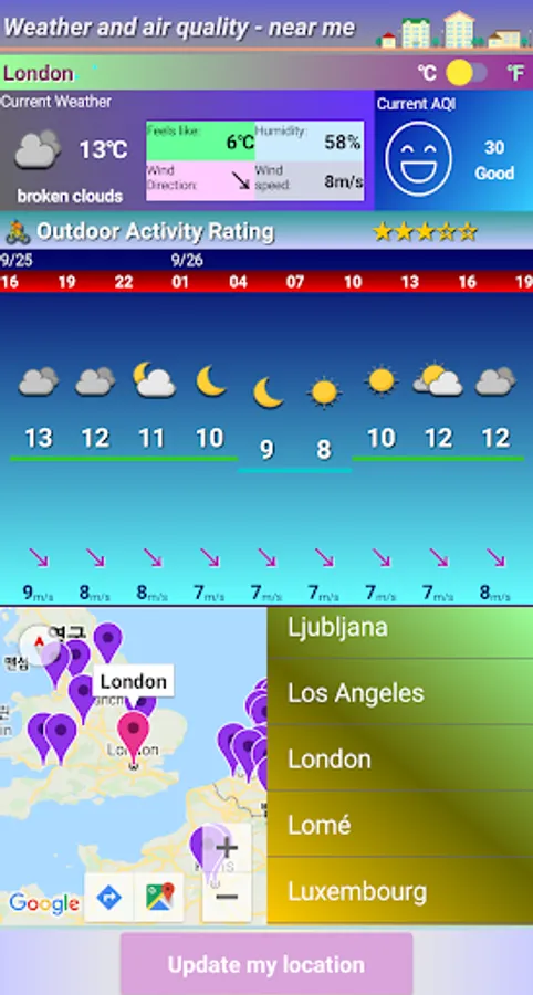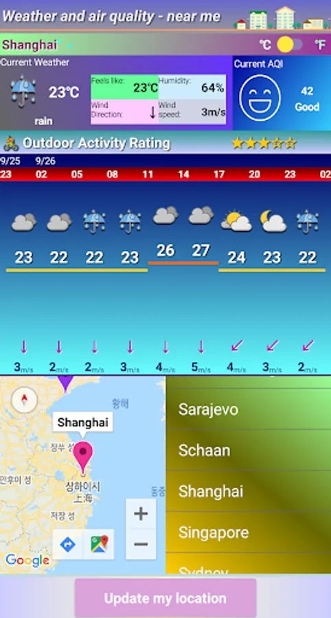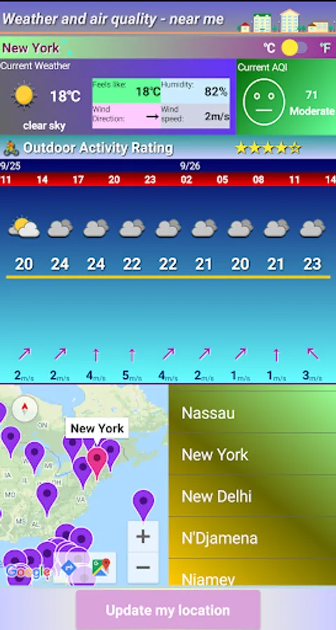 This is an app that shows weather and air quality information in different regions of the world wide area.