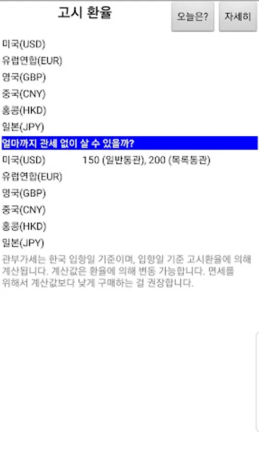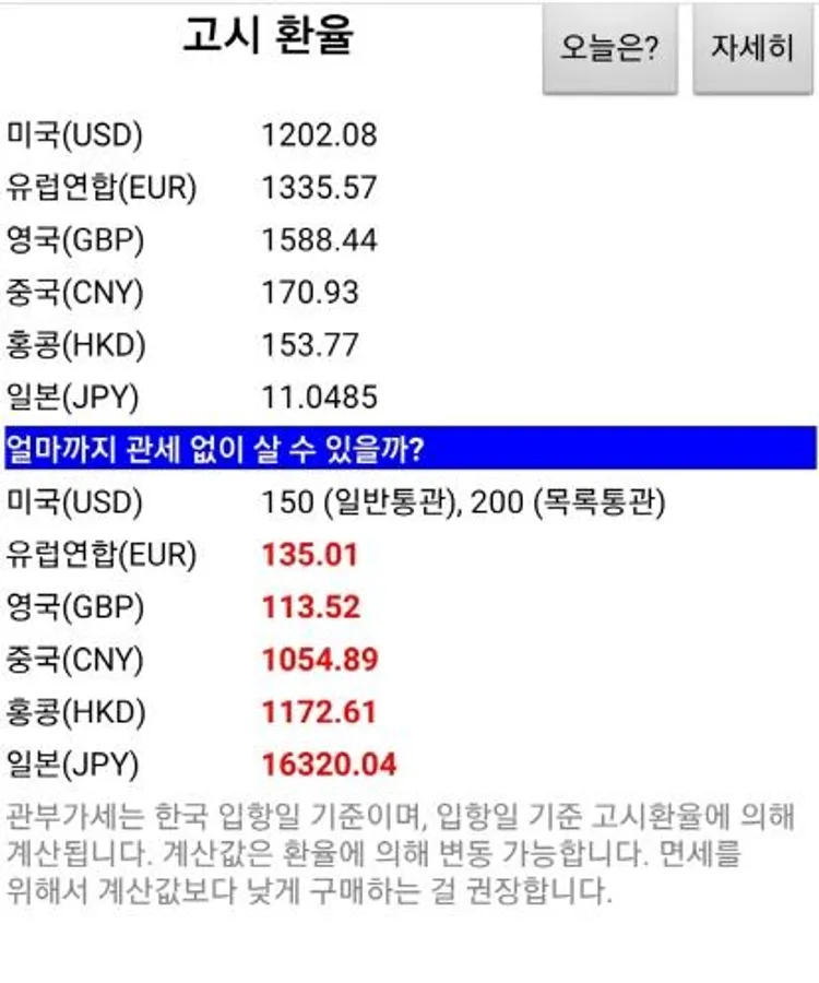 오늘은? 버튼을 누르면 구매 안전선(면세범위)을 계산해 줍니다.