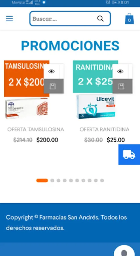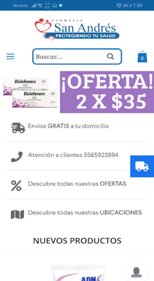 Mobile application of the company Farmacia San andrés, Where you can make purchases of pharmaceutical products, see offers of the company or contact it With support for help with the purchase.
