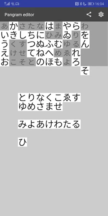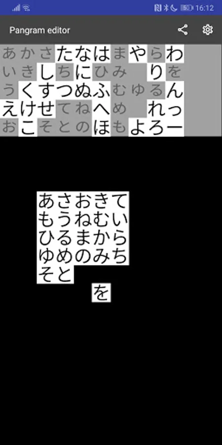 An app that helps you sort hiragana and create Iroha song-like sentences (pangrams). You can sort hiragana with your finger or share it with other apps from the "Share" menu.